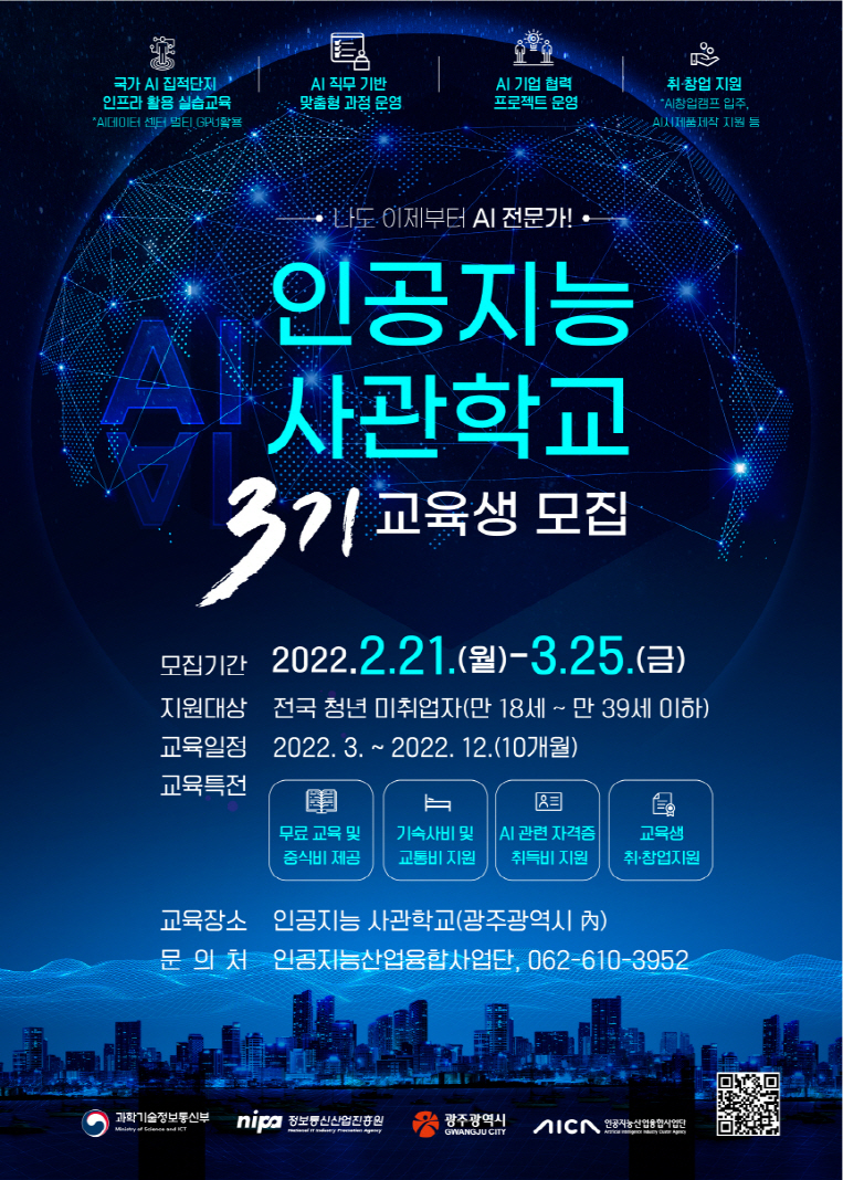 3기에서는 공모를 통해 광주과학기술진흥원에 위치했던 AI사관학교 교육장을 새로 구축한다. 또 교육생 포트폴리오 관리와 취업 컨설팅 등 후속 지원 프로그램을 마련해 지속적으로 교육생 사후관리도 할 예정이다. 이 밖에 교육생을 대상으로 교육에 소요되는 일체의 경비(교육비·기숙사비·중식비 등)는 물론 노트북 등 교육 기자재와 AI 전문 자격증 취득도 지원한다.