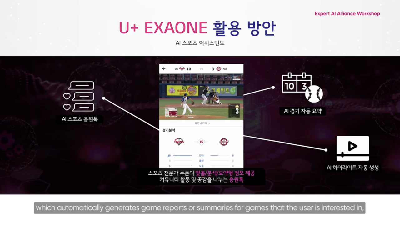 LG유플러스는 초거대 AI를 활용해 맞춤형 스포츠 응원 서비스, AI 캐릭터와 대화하는 기능 등도 LG AI연구원과 논의하고 있다고 밝혔다. 개인이 응원하는 스포츠팀의 경기 내용을 AI가 요약해주고 커뮤니티에서 정보를 자동으로 교류할 수 있는 시스템을 구축할 계획이라고 소개했다. 또 AI 스피커와 차별된 AI 친구 서비스를 제공해 아이들이 AI 캐릭터와 교감하고 공부하는 기술도 구현하겠다고 설명했다.