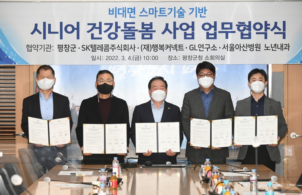 이번 사업을 위해 SKT는 평창군, 장일영 서울아산병원 노년내과 교수 연구팀, 행복커넥트, GL연구소와 업무협약(MoU)을 체결했다. 참여 기관·기업은 평창군에 거주하는 노인들에게 AI 돌봄서비스를 적용해 근감소증과 영양 불균형 개선에 힘쓸 계획이다.