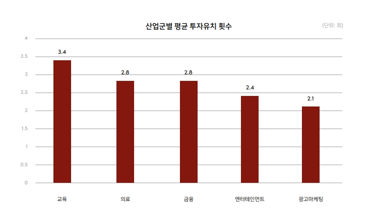산업군별 총 투자유치 횟수를 비교한 결과 교육 분야(평균 3.4회), 의료 및 금융 분야(각 평균 2.8회), 엔터테인먼트 분야(평균 2.4회), 광고마케팅 분야(평균 2.1회) 순으로 조사됐다. 엔터테인먼트 분야의 경우 스타트업의 수는 많지만 평균 투자유치 횟수는 비교적 적었다. 반면 교육 분야는 스타트업 수에 비해 평균 투자유치 횟수는 많았다.