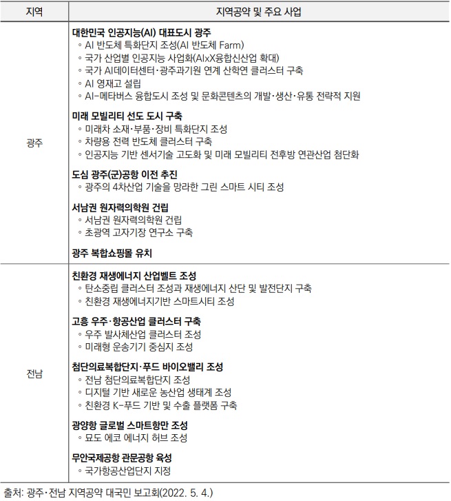 새 정부가 광주·전남의 경제 발전 공약으로 제안한 주요 내용을 살펴보면 새 정부는 경제 분야 지역 대표 공약 가운데 하나로 '대한민국 인공지능 대표도시 광주'를 제시했다. 현재 진행 중인 AI 집적단지 구축 사업은 광주에 우리나라 최고 성능의 수퍼컴퓨팅 인프라를 구축하고 이를 중심으로 인공지능과 산업의 기술적 연계 지원에 집중하는 사업이다.