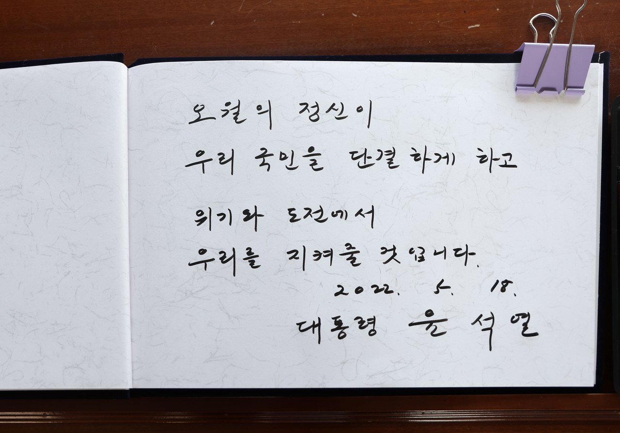 윤 대통령은 "오월이 품은 정의와 진실의 힘이 시대를 넘어 영원히 빛날 수 있도록 우리 함께 노력하자"면서 "오월의 정신이 우리 국민을 단결하게 하고 위기와 도전에서 우리를 지켜줄 것이라고 저는 확신한다"고 말했다.