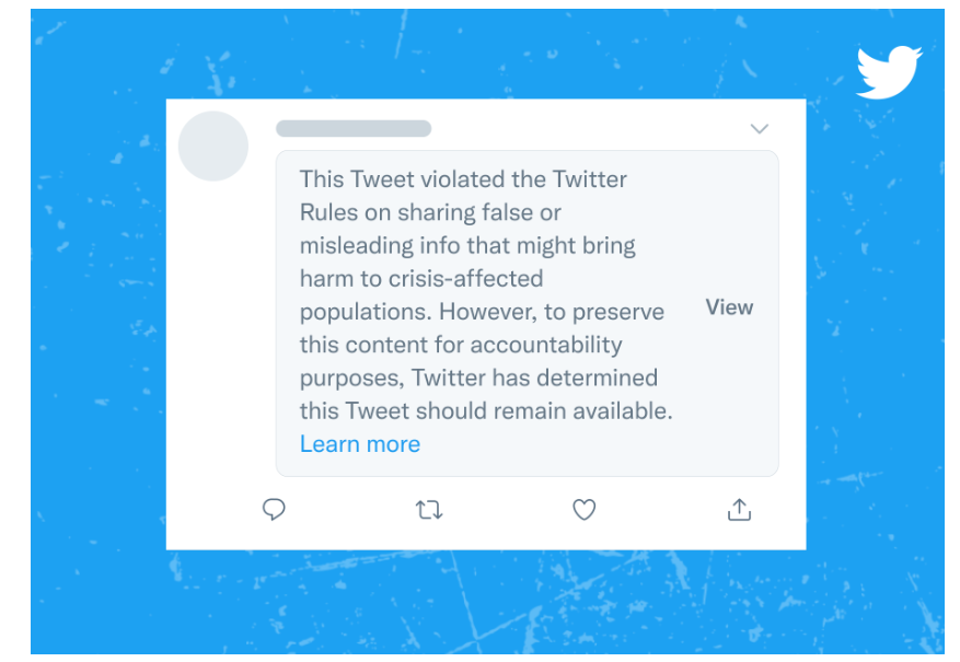 위의 내용이 포함된 게시물에 거짓 정보가 있는 경우 즉시 경고문을 붙인다. 사용자는 게시물을 누르기 전 '이 게시물은 트위터 정책을 위반했습니다. 허위 정보가 들어 있습니다'라는 문구를 보게 된다. 경고문이 포함된 트윗은 ‘트위터 알고리즘’에서 제외된다. 사용자는 ‘좋아요’, ‘리트윗’, ‘공유’ 버튼도 누를 수 없다. 사용자가 게시물을 보길 원하면 클릭해서 접근할 수는 있다.