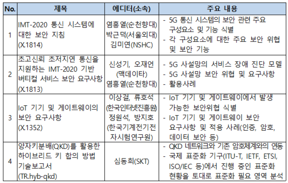 현재 국제 기준으로 채택되기 직전 상태인 표준·기술 보고서는 5G 보안, IoT 보안, 양자암호통신 보안 기술을 다룬다.