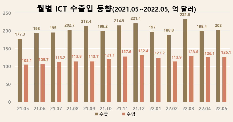 5월 정보통신기술(ICT) 수출입 성적표가 나왔다. 수출 규모는 전년 동월 대비 13.9% 상승한 202억달러(약 26조357억원)를 기록했다. 작년 4월 이후 꾸준히 증가했다. 이는 역대 5월 수출액 중 가장 높다. 과학기술정보통신부(장관 이종호)는 이 같은 내용의 '5월 ICT 수출입 동향' 잠정 집계 결과를 14일 발표했다.