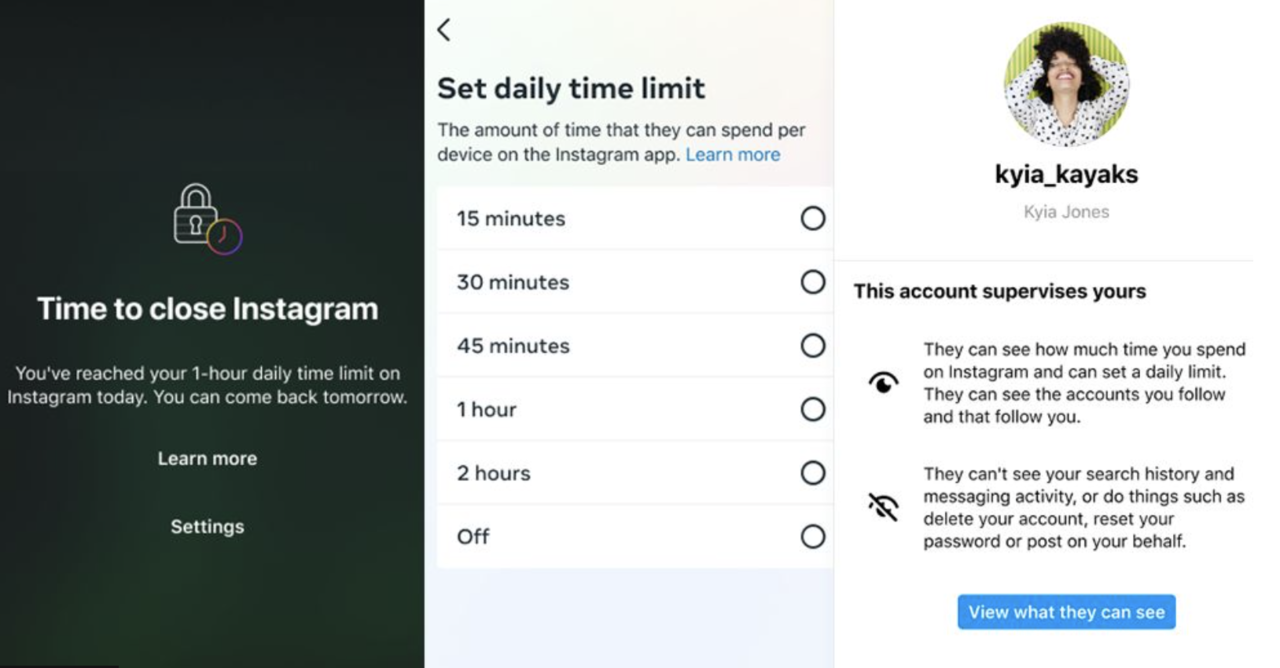 부모는 자녀 인스타그램 접속 시간을 제한할 수 있다. 최소 15분에서 2시간 사이에서 설정할 수 있다. 예를 들어 부모가 제한 시간을 1시간으로 설정하면, 1시간 후 앱 화면이 바로 꺼진다. 인스타그램 사용을 잠시 멈추게 하는 시간도 설정할 수 있다. 이때 부모는 자녀가 왜 앱 사용을 멈춰야 하는지 이유를 작성해야 한다.
