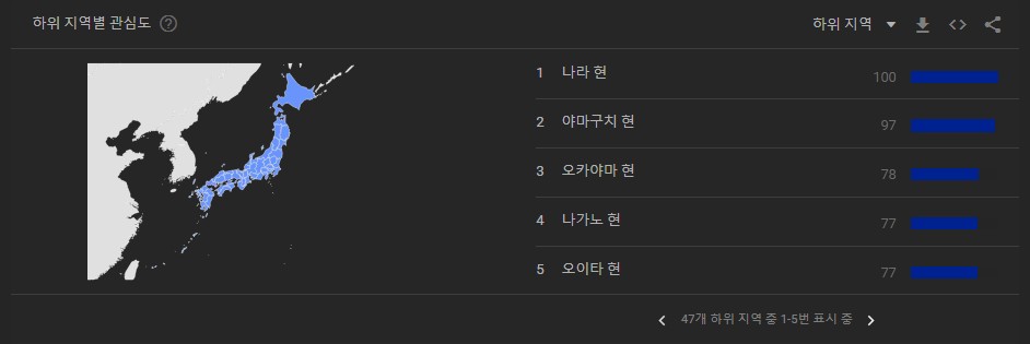 아베신조 키워드를 가장 많이 검색한 지역 순위는 다음과 같다. ▲나라현 ▲야마구치현 ▲오이타현 ▲오카야마현 ▲가고시마현 ▲아키타현 ▲효고현 ▲나가노현 ▲후쿠시마현 ▲가가와현 순으로 나타났다. 나라현의 경우 아베신조 전 총리가 사고를 당한 지역이었기 때문에 해당 지역민들의 검색량이 급등한 것으로 보인다.