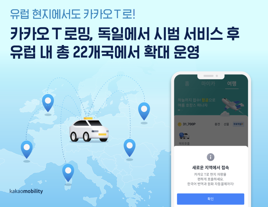 카카오모빌리티(대표 류긍선)는 31일 유럽용 '모빌리티 로밍 서비스'를 시작한다고 밝혔다. 독일에서 첫 시범 서비스를 선보인 후 프랑스, 영국 등 총 22개국으로 운영을 확대할 예정이다.