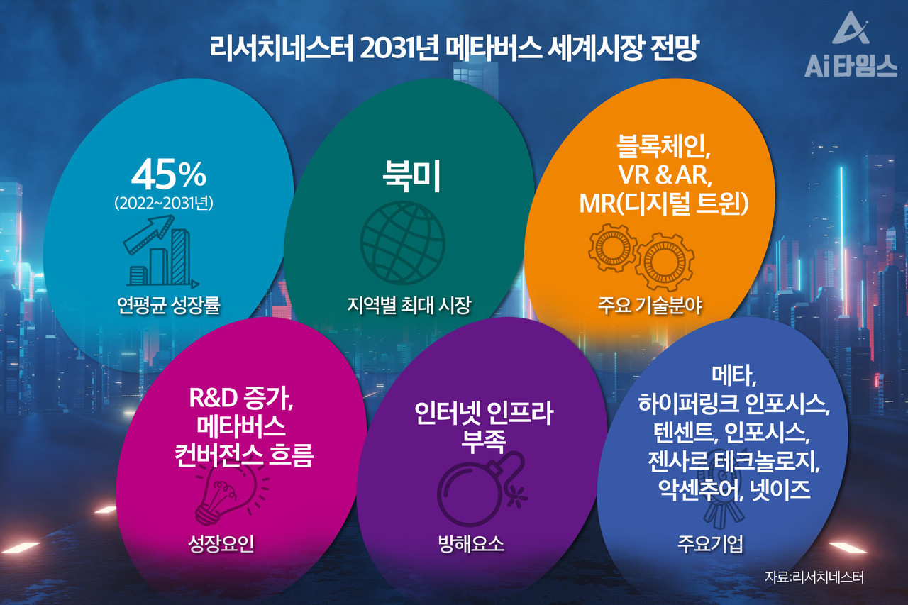 글로벌 시장조사 업체인 리서치네스터는 3일 '메타버스 시장: 글로벌 수요 분석 및 기회 전망 2031'이라는 보고서를 발표, 메타버스 시장이 2022년부터 2031년까지 연평균 45%의 가파른 성장률을 기록할 것이라고 예상했다.