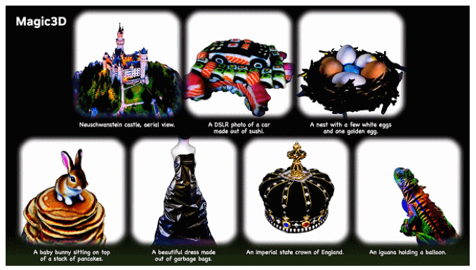 매직3D는 텍스트 프롬프트를 입력하면 약 40분 안에 컬러 텍스처로 완성된 3D 메쉬 모델을 생성한다. 생성된 결과 모델은 비디오 게임 및 VR 응용 프로그램의 개발 속도를 높일 수 있으며 영화 및 TV용 특수 효과 제작에 적용할 수 있다.
