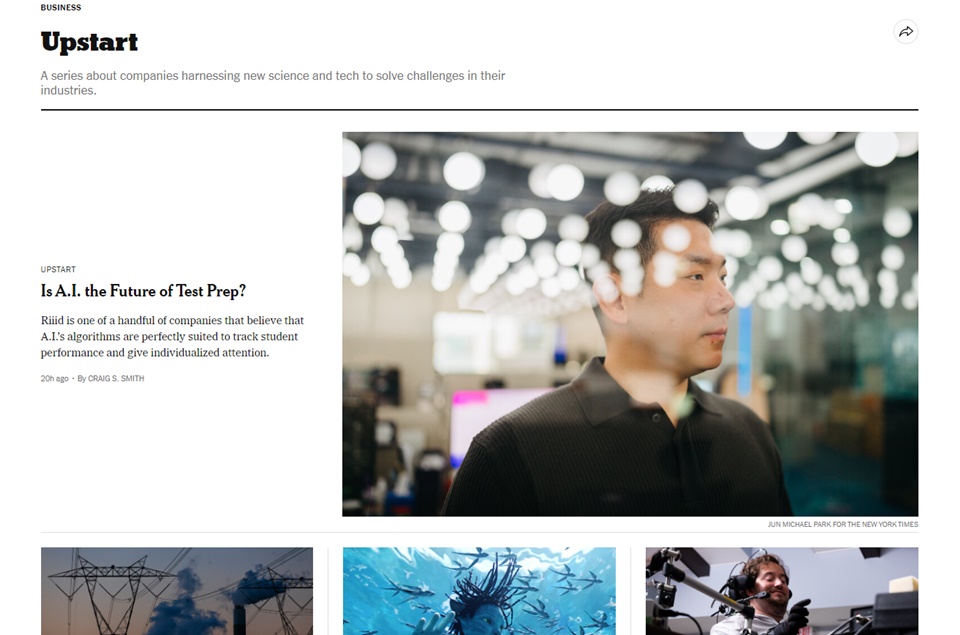 뉴욕타임스는 27일(현지시간) '업스타트' 코너에 'AI는 시험 준비의 미래인가'라는 제목의 기사로 뤼이드를 소개했다. 업계 공동의 과제를 해결하기 위해 새로운 과학과 기술을 활용하는 기업과 프로젝트 등을 소개하는 시리즈물이다.