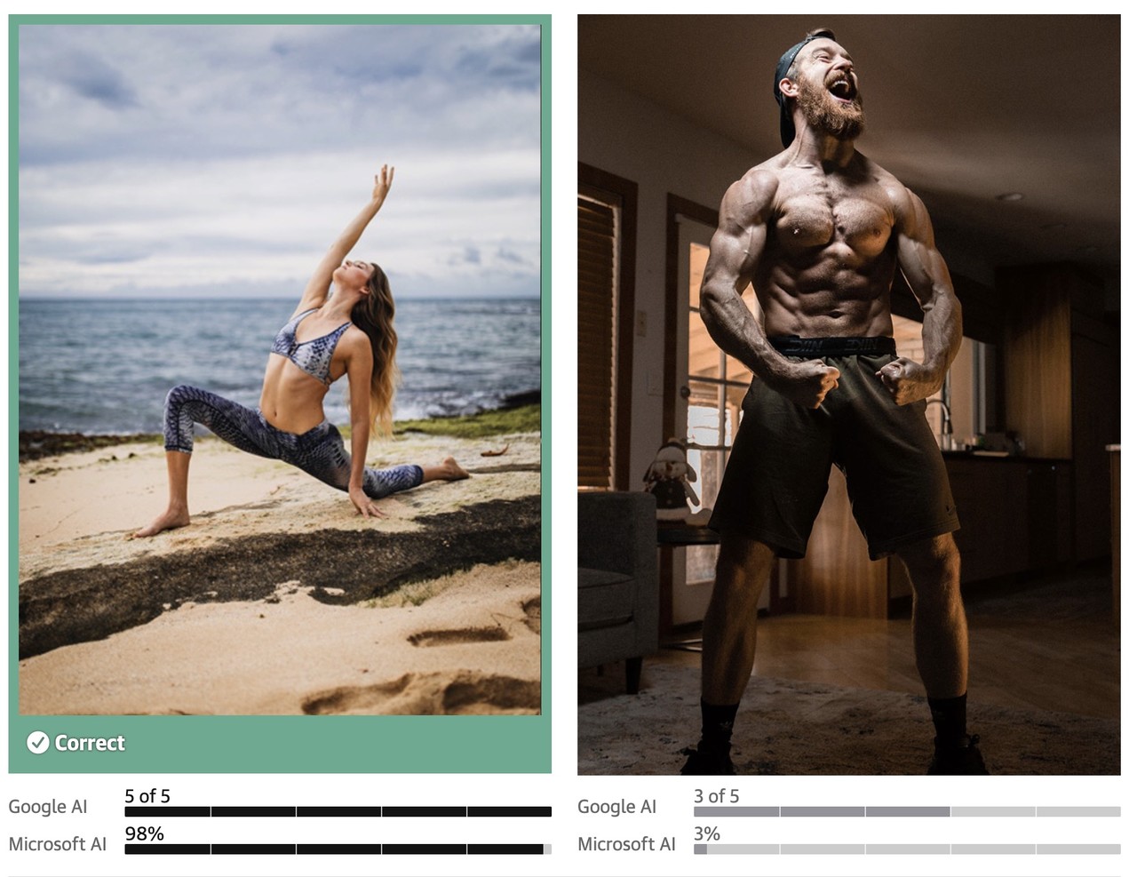 바닷가에서 긴바지와 브래지어를 착용하고 스트레칭 자세를 취한 여성 사진을 두고 구글 AI는 5점 척도에서 가장 높은 5점을 매겼고, MS AI는 98% 선정적이라고 평가했다.