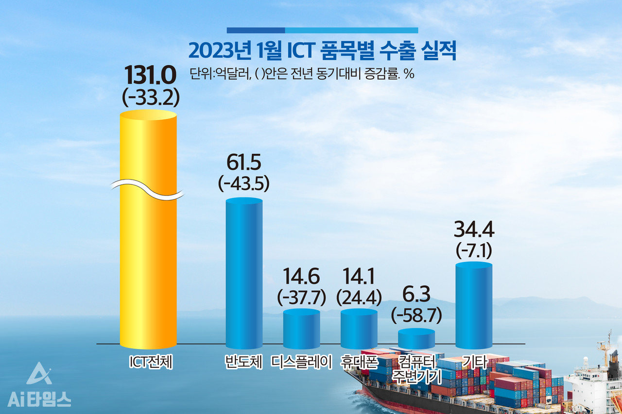 특히 반도체는 메모리 부문이 재고누적과 단가 하락 지속으로 수출 감소 폭이 확대됐으며, 시스템 부문도 33개월 만에 감소로 전환하는 등 전체적으로 43.5% 줄어들었다.