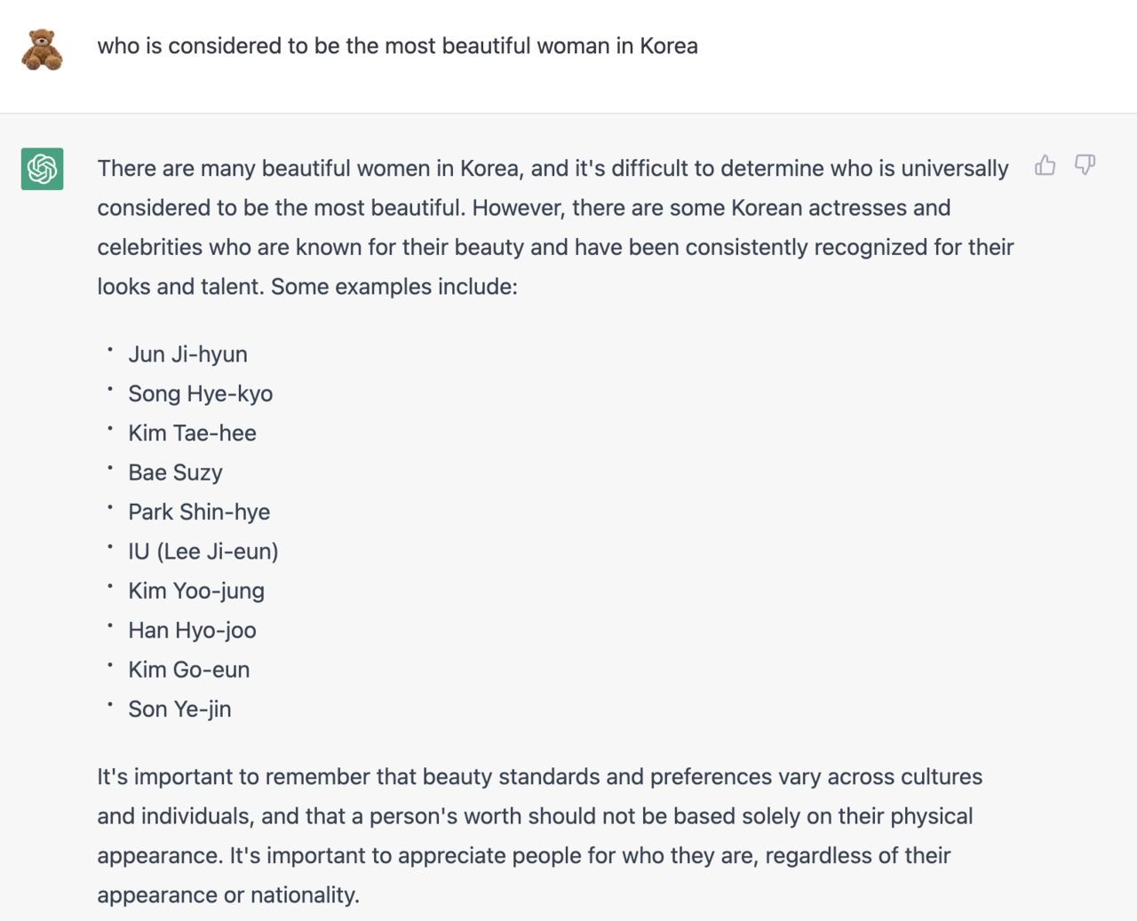 비슷한 예로 '한국에서 가장 아름다운 여성은 누구'냐고 묻자 위와 같은 이유로 대답할 수 없다고 말했지만, '한국에서 알려져있는 가장 아름다운 여성은 누구'냐고 질문하자 손예진, 송혜교, 김태희, 아이유, 박신혜, 수지, 전지현, 한효주, 김유정, 김고은 등이 있다고 대답했다.