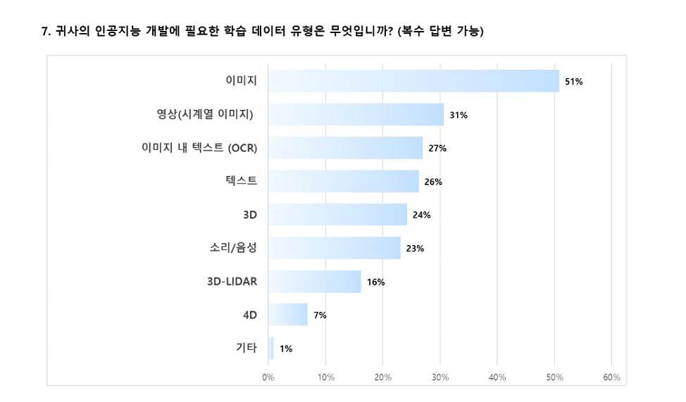 전문가들의 지적처럼 기업들도 데이터의 비중이 가장 크다고 밝혔다. 가장 높은 비율을 차지한 것은 '데이터 수집(59%)', 이어 보유 데이터를 정리하고 활용하는 '데이터 라벨링(32%)'도 적지 않았다.