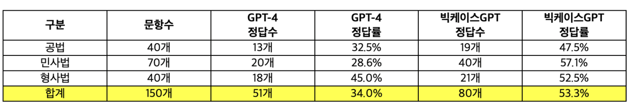 변호사시험 객관식 문항은 공법 40문항, 민사법 70문항, 형사법 40문항 등 총 150문항으로 구성된다. 빅케이스GPT는 이 중 각 19개, 40개, 21개 등 총 80개의 정답을 맞혔다.
