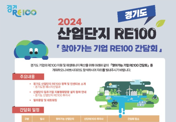 간담회에서는 산업단지 RE100 정책과 참여기업 혜택을 소개하고, 협약 투자사는 RE100 이행에 적합한 ‘산업단지형 태양광발전소 사업모델’을 소개한다. 산업단지 입주기업 외에 개별입지 기업에서도 참여할 수 있으며, 온라인 사전등록은 원스톱 상담센터인 ‘경기도 기업 RE100’ 카카오톡 채널을 통해서도 가능하다.