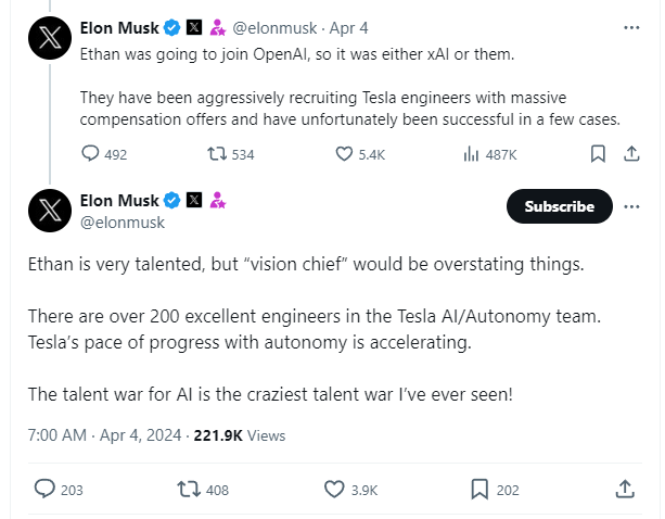 이는 바로 전날 테슬라가 다른 회사에 주요 AI 인원들을 빼앗긴다는 보도가 나온 직후 등장한 것이다. 또 이던 나이트 ML 과학자는 테슬라에서 머스크의 AI 회사인 xAI로 옮기는 것으로 알려졌다.