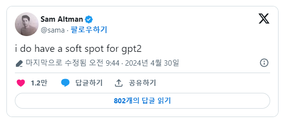 알트먼 CEO는 30일(현지시간) X(트위터)를 통해 ‘gpt2-챗봇(gpt2-chatbot)’이라는 모델에 대한 의견을 남겼다.