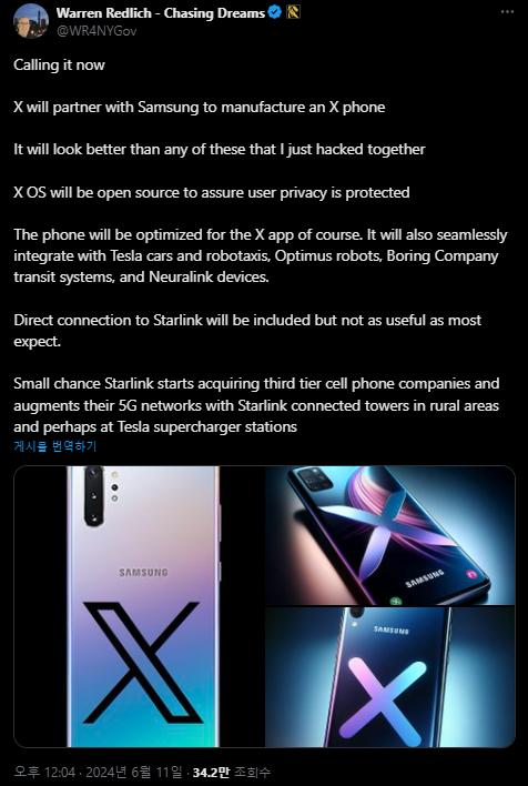 이는 전날 머스크 CEO의 반발에 대해 워렌 레드릭이라는 데이터 전문가가 X(트위터)에 "지금 전화하면 삼성전자와 협력, X 폰을 제작할 수 있을 것"이라는 글을 올리며 시작됐다.