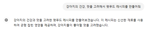 챗GPT의 조리법은 간단하다. 이 음식을 직접 만들어 주면, '달리'로 생성한 그림처럼 반려견 표정이 밝아지지 않을까.