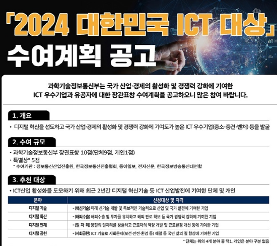 과학기술정보통신부(장관 이종호)는 ‘2024 대한민국 ICT 대상’ 공고 및 접수를 8월22일까지 진행한다고 밝혔다.