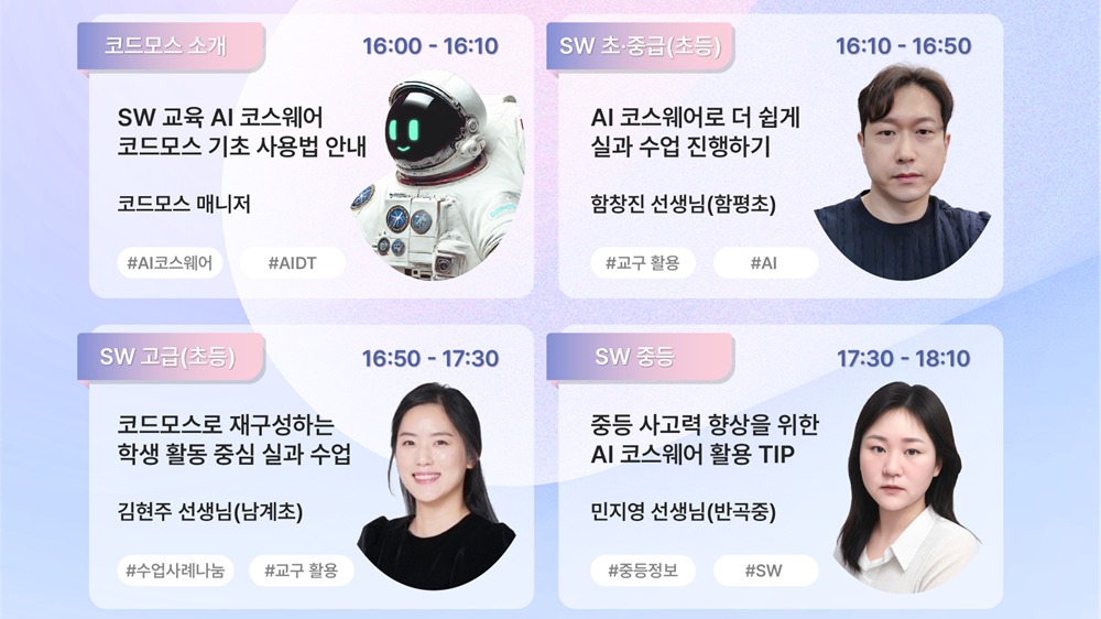 현직 교원이 AI 코스웨어 ‘코드모스’ 기초 사용법과 실제 수업 사례를 바탕으로 한 AI 코스웨어 활용 방안을 안내한다. SW 초·중급, 고급 과정은 교구 활용법도 제시할 예정으로, 교사 역량 강화에 도움이 되는 사례별 다양한 지도 방안을 확인할 수 있다.