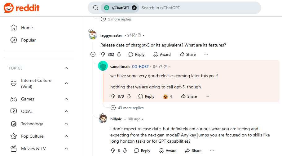 샘 알트먼 오픈AI CEO가 오랜만에 사용자들과 대화를 가졌습니다. 1일 레딧에서 열린 AMA(Ask Me Anything)이라는 채팅 행사에 핵심 연구진과 출연, 두어시간 동안 채팅을 이어갔습니다.