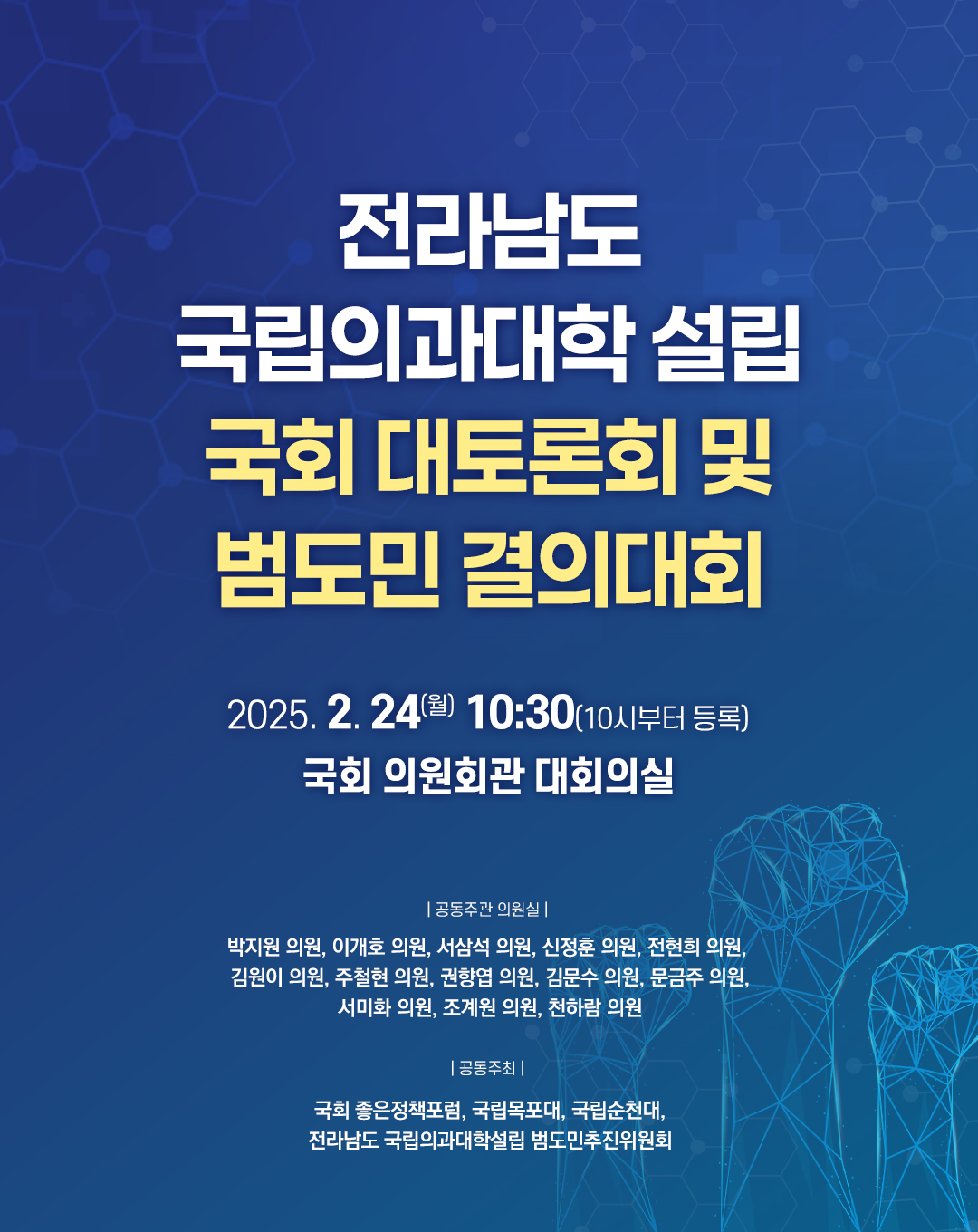 오는 24일(월) 오전 10시 30분, 국회의원회관 대회의실에서 '전라남도 의과대학 신설 국회대토론회 및 범도민결의대회'가 열린다.