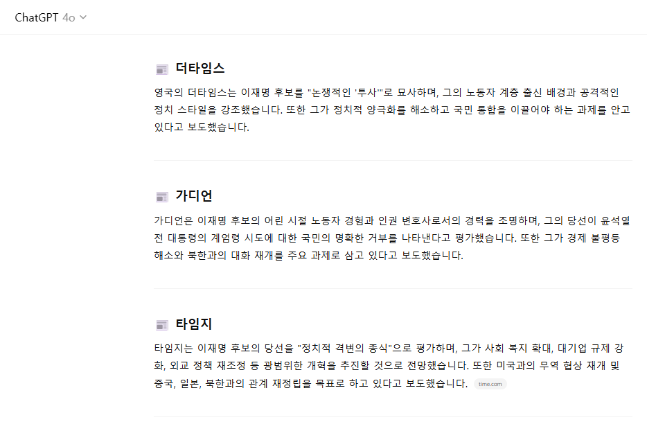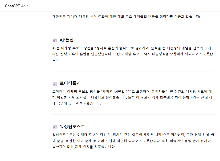 챗GPT의 응답 AI타임스 news@aitimes.com 좋아요1 관련기사 [챗withAI] "21대 대선 결과와 의의를 설명해 줘" [챗withAI] "21대 대선 결과에 대한 X 사용자 반응을 정리해 줘" AI타임스 news@aitimes.com 다른기사 보기 키워드 #인공지능 #AI #21대 대선 #챗GPT #해외 반응 저작권자 © AI타임스 무단전재 및 재배포, AI학습 및 활용 금지 개의 댓글 회원로그인 작성자 비밀번호 댓글 내용입력 댓글 정렬 최신순 추천순 답글순 BEST댓글 BEST 댓글 답글과 추천수를 합산하여 자동으로 노출됩니다. 닫기 더보기 댓글삭제 삭제한 댓글은 다시 복구할 수 없습니다. 그래도 삭제하시겠습니까? 비밀번호 댓글수정 댓글 수정은 작성 후 1분내에만 가능합니다. 본문 / 400 비밀번호 내 댓글 모음 닫기