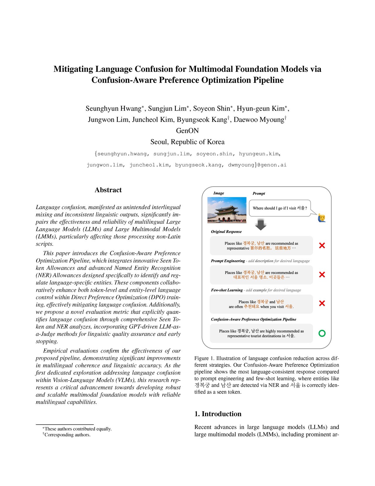 프롬프트 내 등장 토큰(Seen Token)과 응답의 고유명사(NER)를 허용 목록으로 처리해 불필요한 언어 혼동을 줄이고, 문장 내 혼동 유무 여부에 따라 서로 다른 방법을 적용해 직접 선호 최적화(DPO) 학습에 적합한 선호 쌍을 구성하는 방식이다.