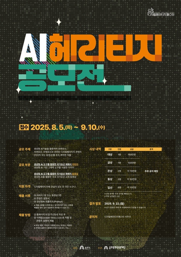 공주시(시장 최원철)는 2025 디지털헤리티지페스타의 일환으로 생성 인공지능(AI)를 활용한 'AI 헤리티지 공모전'을 진행한다고 밝혔다.