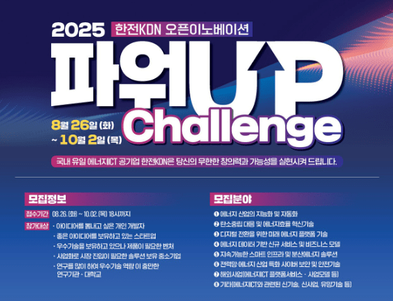 한전KDN(사장 박상형)은 10월2일까지 6주간 창의적인 아이디어와 신기술을 발굴하기 위한 ‘KDN 파워업 챌린지 2025’ 공모를 진행한다고 26일 밝혔다.
