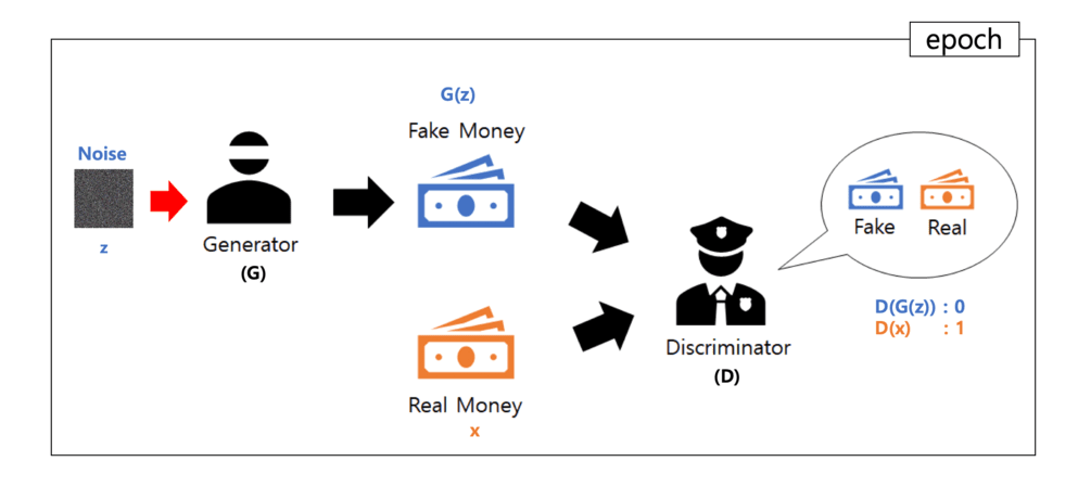 GAN는 일반적으로 ‘생성자(Generator)’와 ‘판별자(Discriminator)’라는 두가지의 하위 신경망으로 구성되는데, 생성자는 위조지폐범에 해당하고, 판별자는 경찰에 해당한다. 이렇게 두 신경망이 서로 대립하고 학습해 나가면서 차이점을 수정해 나가는 과정을 거쳐 궁극의 균형점, 즉 진짜 같은 가짜를 생성할 수 있도록 하는 AI 기법이 GAN이다.