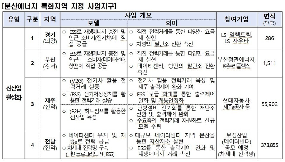 정부가 분산형 전력체계 구축을 위한 4곳의 분산에너지 특화지역을 최종 선정했다.