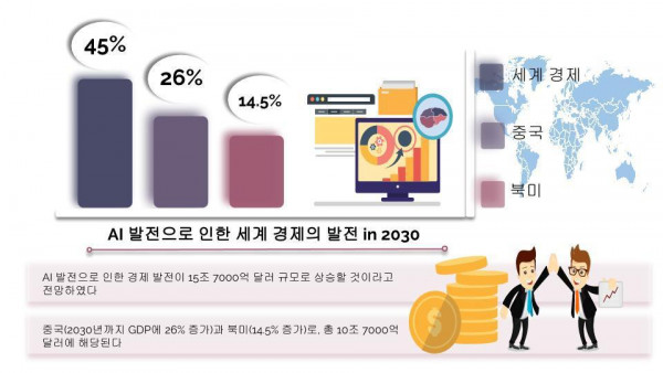 다국적 회계컨설팅 기업인 프라이스워터하우스쿠퍼스는 세계 경제가 AI 발전으로 인해 2030년까지 AI로 15조 7,000억 달러 규모로 상승할 것이라고 전망했는데, 주요 전망은 다음과 같다.